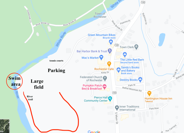 - Walk across big field to far right corner and look for river entrance in trees.